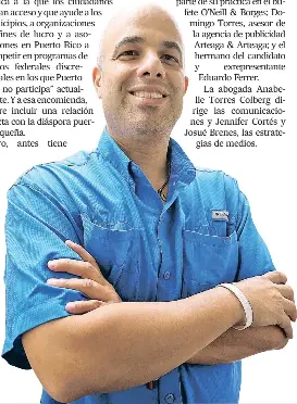 Pero, antes tiene que ganar la candidatura del PPD en las primarias del domingo, y en ese esfuerzo, además de Comas Pérez, trabaja un equipo de asesores encabezado por la exdirectora de la Oficina de Gerencia y Presupuesto bajo la administración de Aníbal Acevedo Vilá, Ileana Fas Pacheco, hija del senador Antonio Fas Alzamora. “Es amiga mía de hace más de 15 años”, afirmó Ferrer. También lo asesora el abogado Yldefonso López, creador de la campaña #yonomequito, y quien figura en la lista de cabilderos de la Cámara, como parte de su práctica en el bufete O’Neill & Borges; Domingo Torres, asesor de la agencia de publicidad Arteaga & Arteaga; y el hermano del candidato y exrepresentante Eduardo Ferrer. La abogada Anabelle Torres Colberg dirige las comunicaciones y Jennifer Cortés y Josué Brenes, las estrategias de medios.