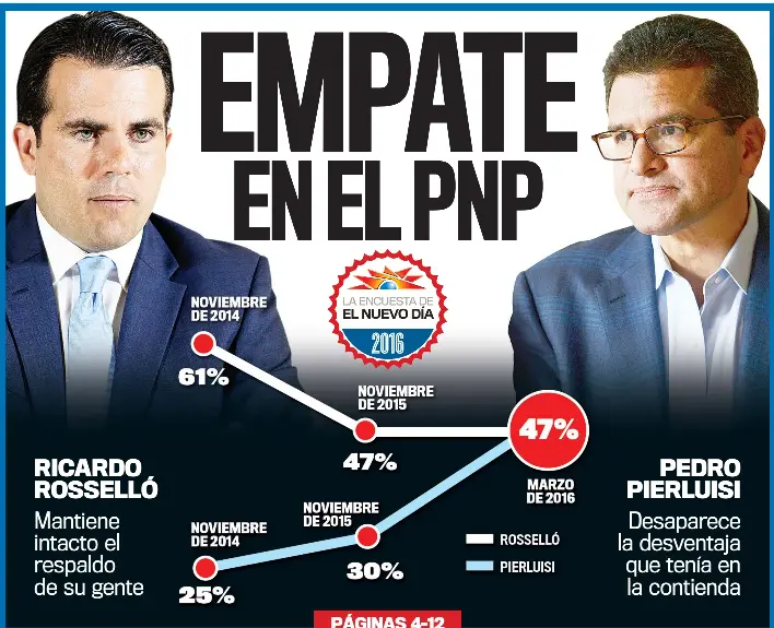 El presidente del Partido Nuevo Progresista (PNP), Pedro Pierluisi, remontó la enorme ventaja que le tenía el doctor Ricardo “Ricky” Rosselló en la contienda por la candidatura a la gobernación de esa colectividad y a tres meses de la primaria, prevista para el 5 de junio próximo, logró alcanzarlo al obtener el 47% de apoyo de los novoprogresistas, exactamente el mismo número que tiene su rival desde el año pasado. Así lo revelan los resultados de La Encuesta de El Nuevo Día a ocho meses de las elecciones.