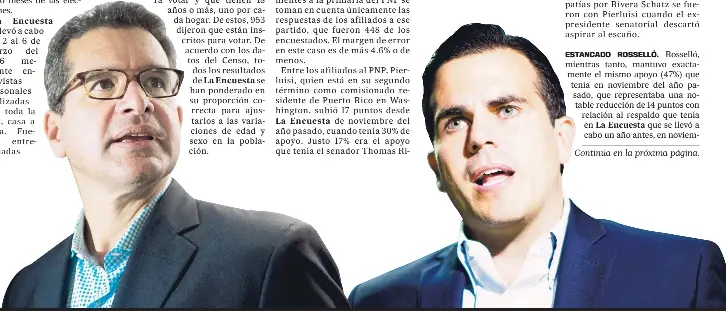 Entre los afiliados al PNP, Pierluisi, quien está en su segundo término como comisionado residente de Puerto Rico en Washington, subió 17 puntos desde La Encuesta de noviembre del año pasado, cuando tenía 30% de apoyo. Justo 17% era el apoyo que tenía el senador Thomas Ri vera Schatz, quien en noviembre del año pasado todavía coqueteaba con la candidatura a la gobernación, de la que eventualmente desistió.