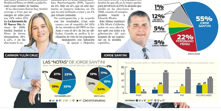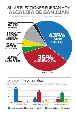 Si las elecciones fueran hoy, Santini aventaja a Cruz por un margen de ocho puntos, 43% sobre 35%. En La Encuesta de El Nuevo Día de mayo de 2008, Santini dominó a Pérez de forma abrumadora, 55% a 22%, y en las elecciones lo su- peró cómodamente con 96,444 votos versus 84,109 que obtuvo el hoy analista político.