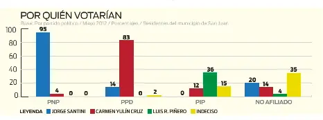 La clave del éxito de Santini está en que cuenta con el apoyo del 95% de los militantes del Partido Nuevo Progresista (PNP), con el 14% de los populares y con el 20% de los no afiliados, un grupo que asciende a 12%. Por su parte, Luis Roberto Piñero, candidato por el Partido Independentista Puertorriqueño (PIP), lograría un 4%. Hay un 11% que en este momento se muestra indeciso, un 5% que no está inclinado a votar y un 2% que rehusó contestar. En contraposición, y de acuerdo con los resultados, Cruz solo cuenta con el respaldo del 83% de los miembros del PPD en San Juan y con el 14% de los no afiliados. Cuando se analiza la inclinación de voto de los populares sanjuaneros con intención