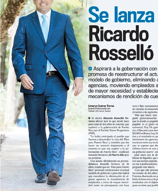 “Le había anticipado al pueblo que íbamos a desarrollar la ruta del ‘Plan para Puerto Rico’ y también que iba hacer un anuncio importante y el anuncio es que voy aspirar a la gobernación de Puerto Rico”, confirmó Rosselló Nevares a El Nuevo Día ayer en primicia.