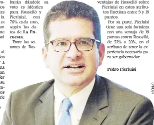 A 48 horas de las primarias, Rosselló aventaja a Pedro Pierluisi en la cantidad de fortalezas que los electores del PNP ven en estos dos precandidatos a la gobernación. OPINIÓN POR ATRIBUTOS. Rosselló mantiene ventajas estadísticamente significativas sobre su contrincante en la base total de afiliados al PNP en los siguientes atributos: poder atraer a nuevos votantes al PNP, tener la capacidad para inyectarle vitalidad al partido, aportar nuevas perspectivas a la situación del país, tener más ideas nuevas para trabajar con la crisis de la isla y tener mejores probabilidades de ganarle a David Bernier, del PPD, en las elecciones generales de noviembre. Las ventajas de Rosselló sobre Pierluisi en estos atributos fluctúan entre 5 y 19 puntos. Por su parte, Pierluisi tiene una sola fortaleza con una ventaja de 19 puntos contra Rosselló, de 52% a 33%, en el atributo de tener la experiencia necesaria para ser gobernador.