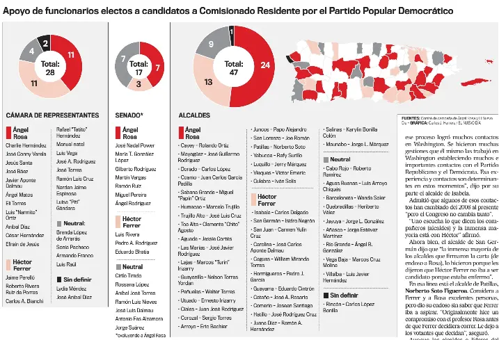 Este diario se dio a la tarea de llamar a los alcaldes y legisladores populares. Unos trece alcaldes están con Ferrer. Tres senadores lo apoyan, mientras que seis optaron por decir que se mantienen neutral. En la Cámara de Representantes, Ferrer tiene 11 endosos mayormente por su experiencia y el liderato demostrado mientras fue presidente del PPD y exrepresentante. Asimismo, Ferrer recibió recientemente el endoso público de los dos líderes de la Asamblea Legislativa: Jaime Perelló y