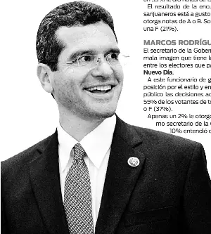 A este funcionario de gobierno, que goza de mucha exposición por el estilo y energía que emplea para apoyar en público las decisiones administrativas de La Fortaleza, el 55% de los votantes de todo el País le dio nota de D (18%) o F (37%). Apenas un 2% le otorgó A a su desempeño como secretario de la Gobernación y otro 10% entendió que merece una B.